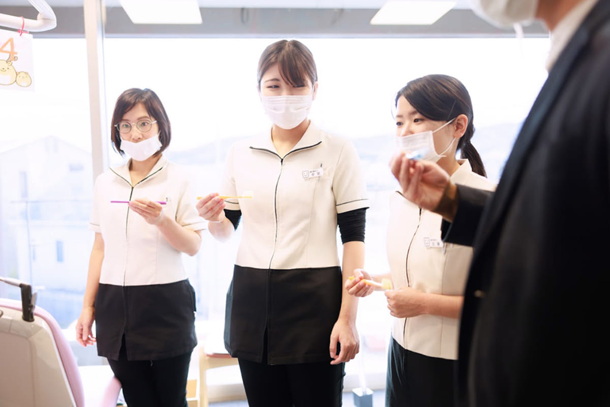 安心の教育体制未経験の方やブランクのある方も安心して働けるよう、スタッフ教育に力を入れています。入職後は、写真つきの業務マニュアルを使用しながら、院長をはじめ先輩衛生士が丁寧に指導いたします。
